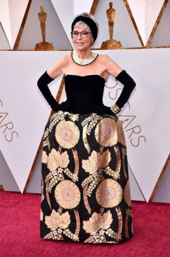 Rita Moreno, mặc một chiếc váy được làm từ vải Obi Nhật Bản mà trước đây bà đã từng mặc ở Oscar năm 1962, khi bà đoạt giải Nữ diễn viên phụ xuất sắc nhất cho phim “West Side Story”.