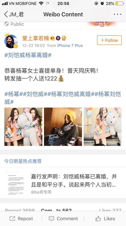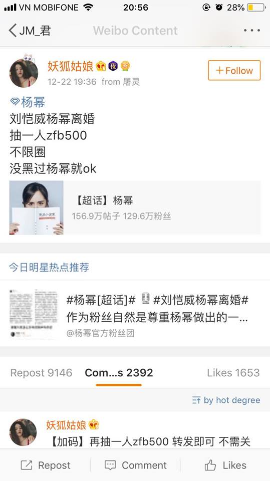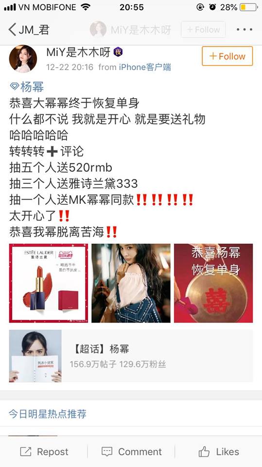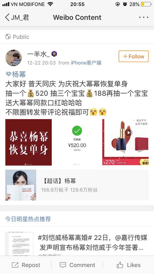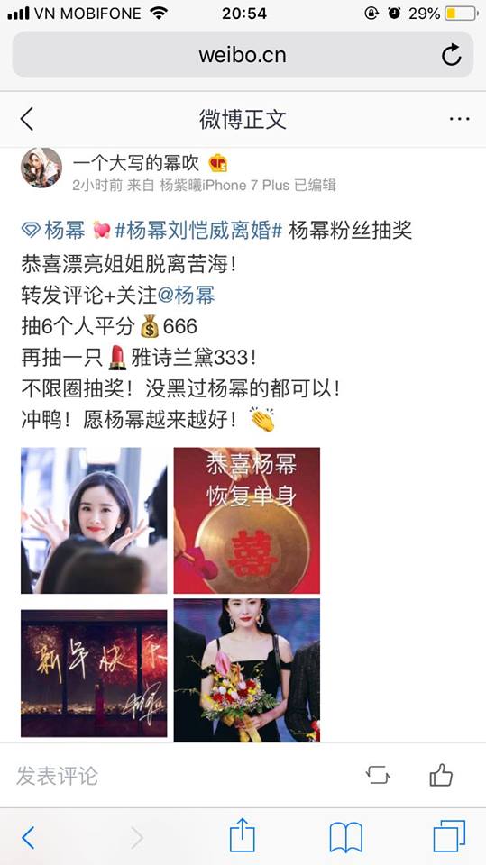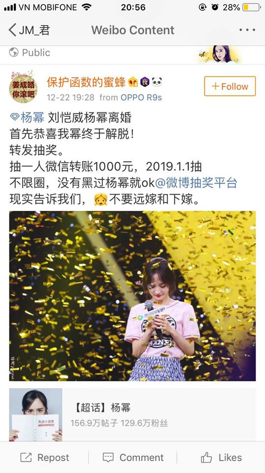 Thế nhưng, trái ngược với mọi thứ, ngay sau khi thông tin Lưu Khải Uy và Dương Mịch ly hôn được đăng tải thì cộng đồng mạng lại vô cùng bất ngờ khi trái ngược với những gì họ nghĩ, fan Lưu Khải và fan Dương Mịch lại mở những cuộc bốc thăm trúng thưởng để chúc mừng cả hai quay lại cuộc sống FA như ban đầu.