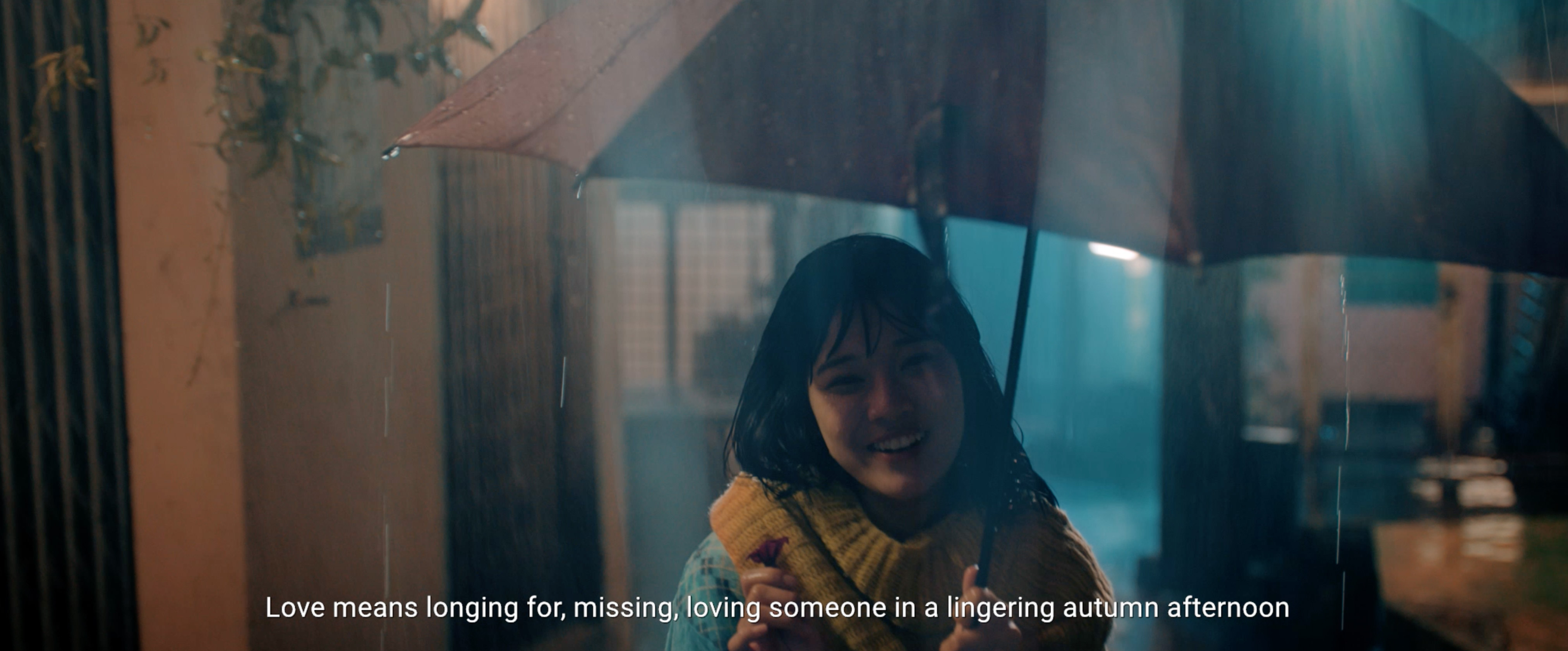 Giọng ca ngọt ngào, nhưng đầy day dứt của Hoàng Yến Chibi xuất hiện một lần nữa ở phân cảnh Hiểu Phương sững sờ chứng kiến nụ hôn giữa Đông Hồ (Tiến Vũ) - hoa khôi Tuyết Anh (Jun Vũ). Đó là một bức tranh gợi nhiều cảm xúc, nơi cánh rừng vắng lặng, cô gái nhỏ nép sau gốc cây, nhìn chàng trai trong mơ đánh dấu sự chiếm hữu trái tim Tuyết Anh lạnh lùng bằng một nụ hôn. Câu hát vang lên như dao cứa: “Em đánh rơi nụ hôn đầu sau lưng anh/ Em đánh rơi tình yêu đầu sau lưng anh”.