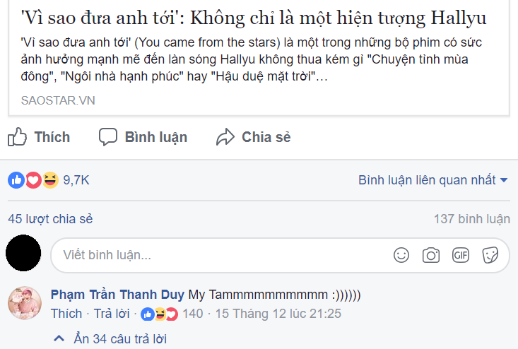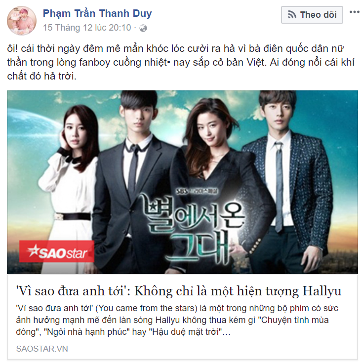 Không kém phần thích thú, háo hức, nam ca sĩ Thanh Duy Idol cũng chia sẻ trên trang cá nhân mạng xã hội Facebook: “Ôi! Cái thời ngày đêm mê mẩn, khóc lóc cười ra rả vì bà điên quốc dân nữ thần trong lòng fanboy cuồng nhiệt, nay sắp có bản Việt. Ai đóng nổi cái khí chất đó hả trời”. Đặc biệt, giọng ca Lỗi ở yêu thương thể hiện mong muốn Mỹ Tâm đóng chính ở Vì sao đưa anh tới phiên bản Việt Nam, theo anh: “Mỹ Tâm không cần diễn gì, chỉ cần bê con người thật nhây nhây của chị vô là ra. Nên nhớ Jun Ji Hyun là sao hạng A vô vai minh tinh quốc dân là hợp lý. Việt Nam thì cũng phải là sao hạng A mới tương xứng”.