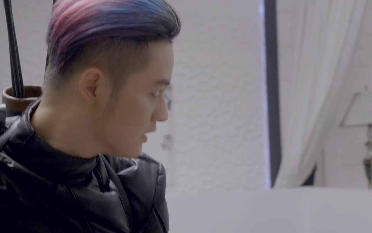 Mái tóc xanh tím của Thanh Duy ấn tượng thay cho màu hồng vốn quen thuộc của anh.