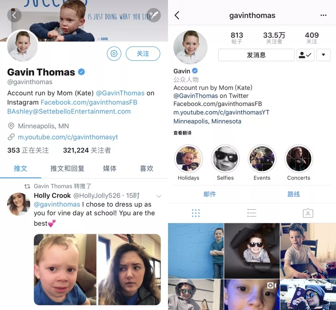 Trên thực tế, những hình ảnh nổi tiếng của Gavin đều xuất phát từ những hoạt động của cậu và người chú của mình được đăng tải trên các mạng xã hội mà ra. Giờ đây, khi Gavin đã có được sự nổi tiếng, cũng đã có trang mạng xã hội Instagram hay weibo cho riêng mình tất cả đều là do mẹ của cậu quản lý, luôn duy trì mối tương tác mật thiết với fan hâm mộ.