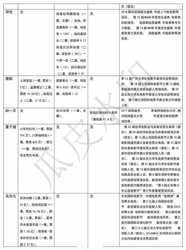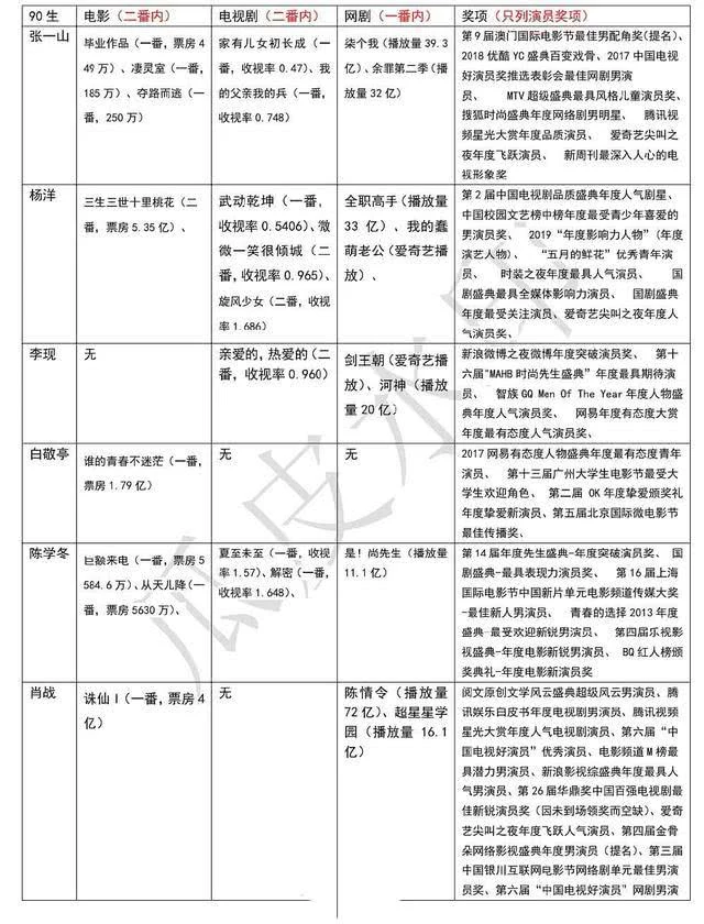Gần đây, dân mạng Trung tổng kết bảng thành tích tiểu sinh sau 90 (không bao gồm sau 95 nên Vương Nhất Bác, Lưu Hạo Nhiên, Vương Tuấn Khải, Ngô Lỗi… không có trong danh sách này). Thống kê với nhiều phương diện khác nhau từ phim điện ảnh, phim truyền hình, webdrama…. đã cho ra đời bảng thành tích của 28 diễn viên. Trong đó, đáng chú ý là những cái tên lưu lượng như Dương Dương, Tiêu Chiến, Lý Hiện…