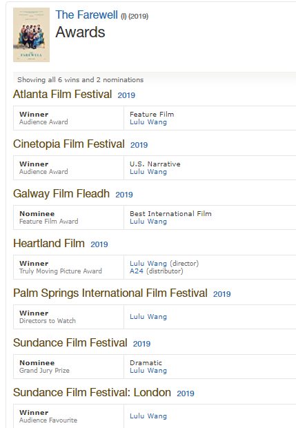 Một sau năm cột mốc đáng nhớ ấy, The Farewell (Lời từ biệt) xuất hiện và được mong đợi sẽ là phiên bản nâng cấp để nối tiếp sự thành công của người tiền nhiệm. Dù chỉ mới ra mắt tại một vài liên hoan phim nhưng Lời Từ Biệt đã nhanh chóng càn quét tất cả giải thưởng và thu về hàng tấn lời khen từ các trang đánh giá, cũng như tạp chí uy tín mà bất kì bộ phim nào cũng hằng mong ước.