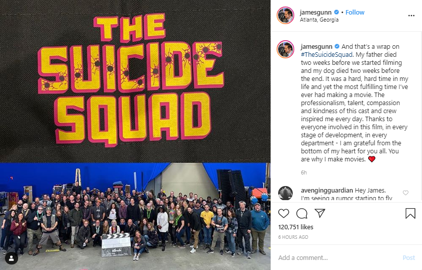 Ngay khi công đoạn ghi hình được kết thúc, James Gunn đã đăng tải một vài hình ảnh lên trang Instagram của mình, kèm theo đó là đôi lời khen ngợi và cảm hơn tất cả đoàn làm phim.