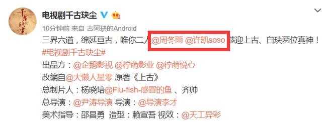 Tác phẩm phim Thiên cổ quyết trần được chuyển thể từ tiểu thuyết Thượng cổ cuối cùng đã đưa ra thông báo về nam nữ chính sau bao nhiêu lần đoán mò của cư dân mạng, nam chính Bạch Huyết sẽ do Hứa Khải đảm nhận và nữ chính Thượng Cổ sẽ do Châu Đông Vũ đảm nhận.