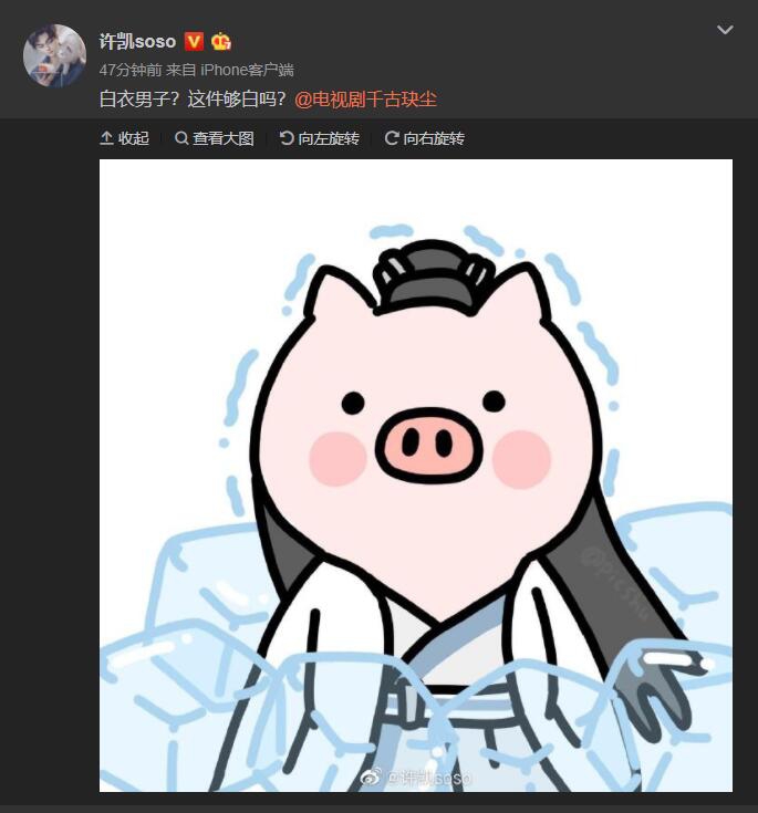 Hứa Khải chia sẻ hình chú heo với nội dung: “Nam tử áo trắng? Áo này đủ trắng chưa?”