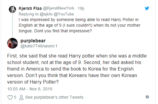 Sau câu trả lời của nữ phóng viên, hàng trăm cư dân mạng quốc tế lập tức đứng ra lên tiếng bảo vệ nữ ngôi sao châu Á và nói rằng Kjersti Flaa giả tạo, cô ấy chỉ đang cố che đi sự vô học, phân biệt chủng tộc của mình mà thôi. Một bình luận nói: “Đầu tiên, cô ấy nói rằng cô ấy đọc Harry potter khi cô ấy là một học sinh trung học, không phải lúc 9 tuổi nhé. Thứ hai, bố cô ấy nhờ bạn của mình ở Mỹ gửi cuốn sách sang Hàn Quốc với phiên bản tiếng Anh. Bạn không nghĩ rằng người Hàn Quốc có bản dịch tiếng Hàn cho Harry Potter hả?”.