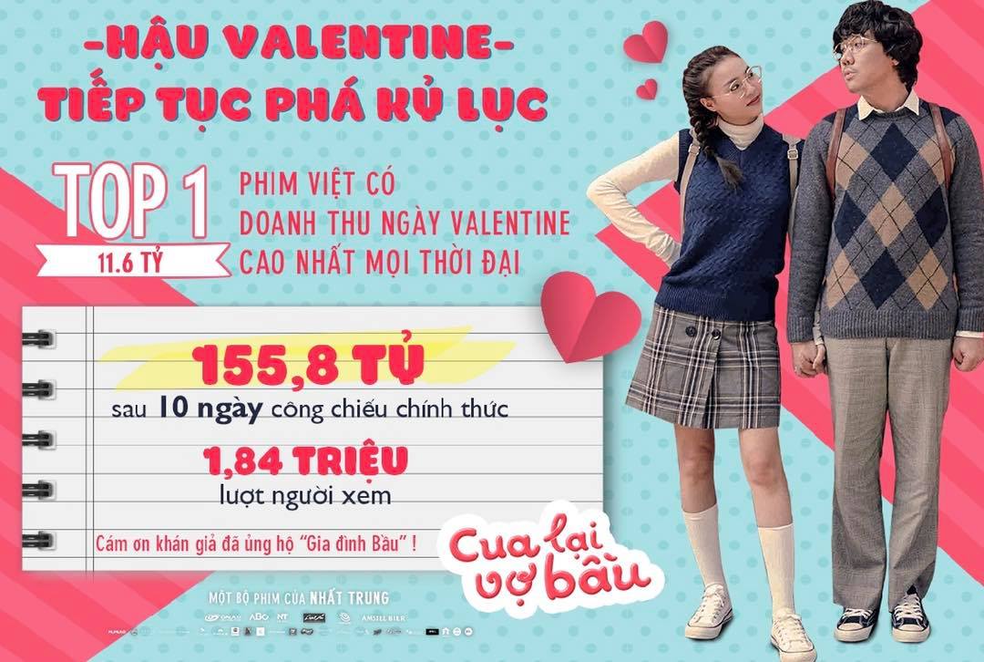 Kỷ lục không dừng lại ở đó, mới đây ekip sản xuất phim Cua lại vừa bầu vừa công bố doanh thu 155,8 tỷ đồng sau 10 ngày chiếu chính thức, đồng thời ghi dấu kỷ lục phòng vé Valentine 2019 với 11,6 tỷ đồng, vượt qua cả bom tấn Hollywood Alita Battle Angel (gần 10 tỷ đồng).