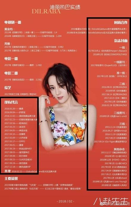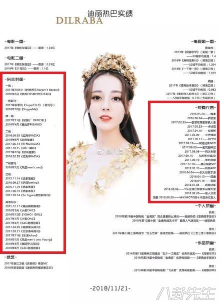 Trong thời gian trước đây, fan Địch Lệ Nhiệt Ba cũng từng thống kê, tổng hợp lại một bảng có tên là “Bảng thành tích của Địch Lệ Nhiệt Ba”, nhưng trong bức ảnh đó chỉ là những lần lên trang bìa tạp chí, tiếp nhận đại ngôn quảng cáo chứ không phải là những tác phẩm truyền hình, điện ảnh.