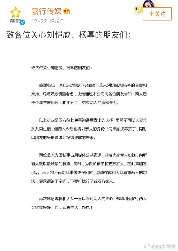 Quyết định trên đây là sự lựa chọn sau khi hai bên đã tiến hành trao đổi tôn trọng lẫn nhau. Mặc dù không còn là mối quan hệ vợ chồng có cuộc sống bên nhau nữa nhưng từ hôm nay về sau Dương Mịch và Lưu Khải Uy sẽ lấy thân phận là người thân của con để cùng nhau chăm sóc, nuôi dưỡng con cái. Đồng thời lấy thân phận là bạn bè chân thành chúc phúc cho tương lai của đối phương.