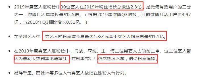 Theo đánh giá từ bảng xếp hạng, có thể thấy lượng fan hâm mộ sao nam tăng mạnh hơn rất nhiều so với sao nữ. Dẫn đầu là Tiêu Chiến với mức tăng 16,77 triệu fan trong năm 2019, trong khi ở phía nữ đứng đầu là Dương Tử khi cô thu hút 12, 51 triệu fan. Hai cái tên lưu lượng nổi bật nhất mùa hè vừa qua kết thành cặp đôi màn ảnh trong Dư sinh, xin chỉ giáo nhiều hơn hứa hẹn sẽ tiếp tục bùng nổ, khiến khán giả dậy sóng trong năm 2020.