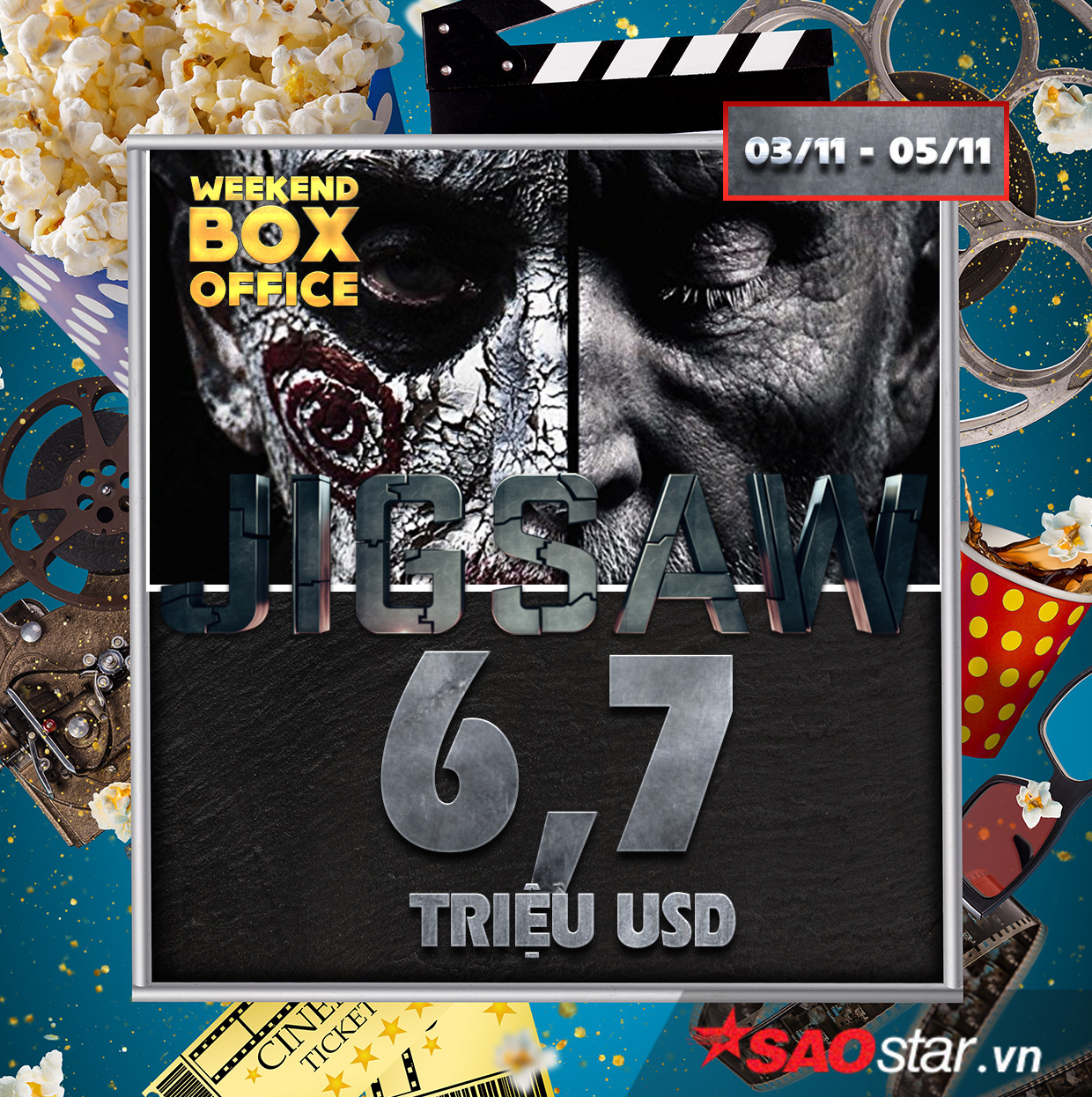 Phim kinh dị Jigsaw xếp vị trí thứ 3 với 6,7 triệu USD. Tính đến nay, bộ phim thu được 28,8 triệu USD tại thị trường nội địa sau 10 ngày công chiếu.