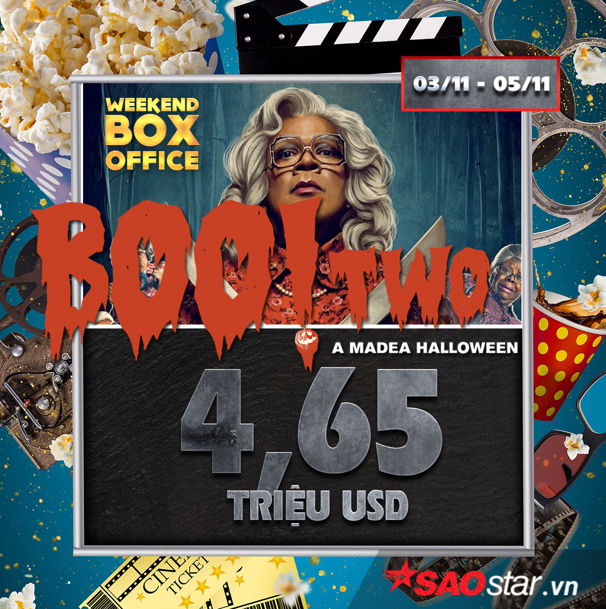 Ngay sau Jigsaw, Tyler Perry's Boo 2! A Madea Halloween xếp vị trí thứ 4. Doanh thu 3 ngày cuối tuần vừa qua là 4,65 triệu USD. Sau 17 ngày trình chiếu, phim đang có 43 triệu USD.