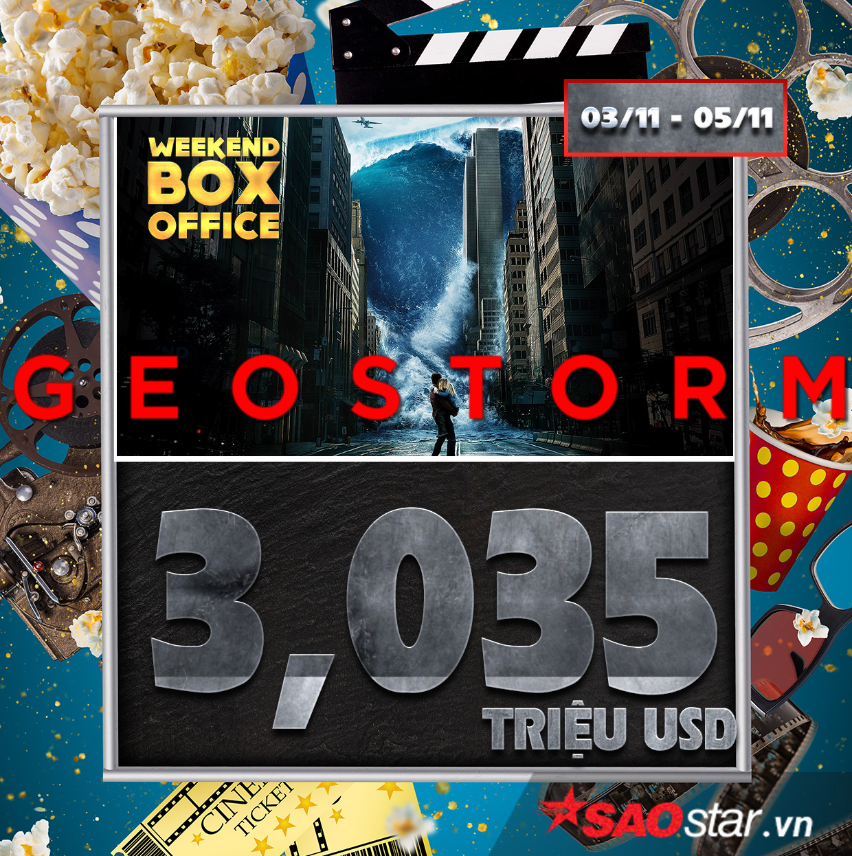 Geostorm thu được 3 triệu USD vào cuối tuần qua, đứng vị trí thứ 5. Kém hơn Tyler Perry's Boo 2! A Madea Halloween, dù cùng ra mắt 17 ngày thế nhưng bộ phim về thảm họa siêu bão địa cầu chỉ thu được 28,7 triệu USD.