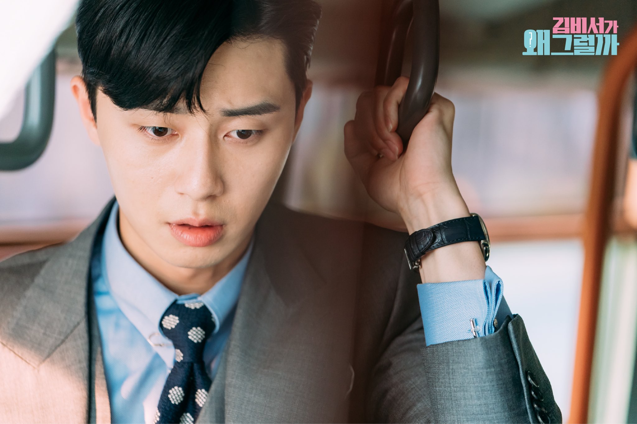 Ở hình ảnh thứ hai, Lee Young Joon tỏ vẻ sợ hãi, giữ chặt lấy tay cầm trên xe bus, ánh mắt chăm chăm về phía thư ký Kim.