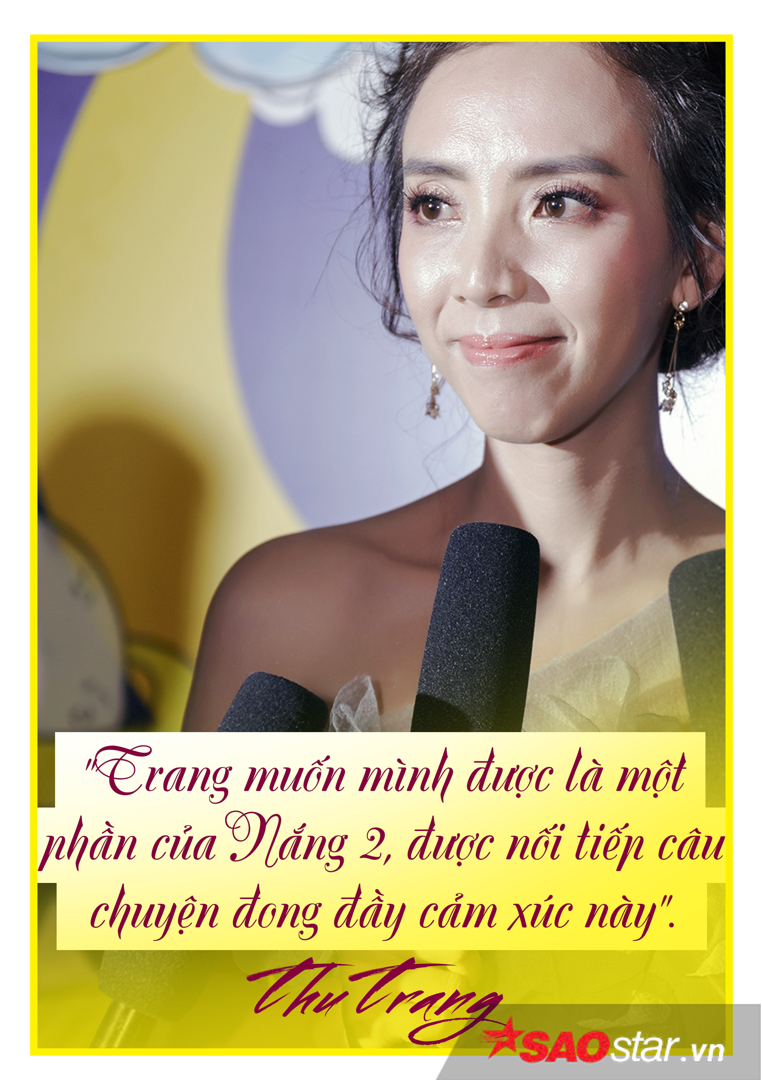 Là người luôn nghiêm túc, kỹ càng trong công việc, Thu Trang luôn muốn khẳng định bản thân bằng những vai diễn có chiều sâu, gây xúc động cho người xem. Việc nhận lời đóng Nắng 2 một phần cũng xuất phát từ sự ủng hộ của khán giả khi mà phần đầu của bộ phim đã gây được tiếng vang.