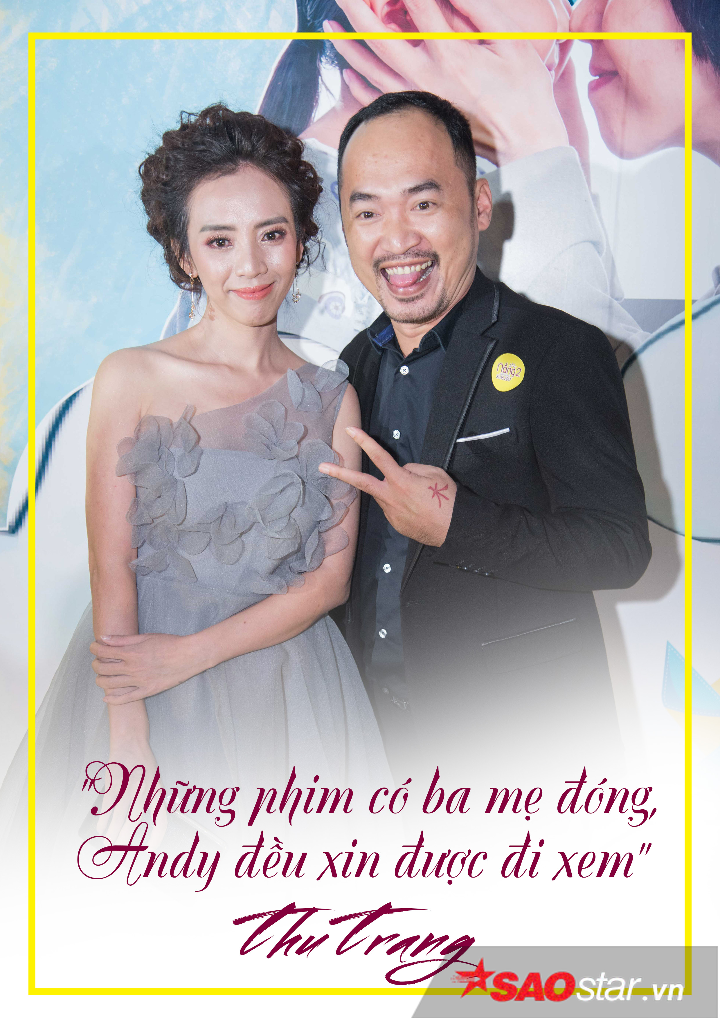 Chia sẻ về chuyện con trai Andy có từng xem phim của Thu Trang đóng hay chưa, nữ danh hài - diễn viên cho biết: “Dĩ nhiên là Andy cũng đi xem mẹ đóng rồi. Trang và anh Luật cũng chưa đặt ra câu hỏi này với Andy, nhưng phim có ba mẹ đóng, Andy đều xin được đi xem”.