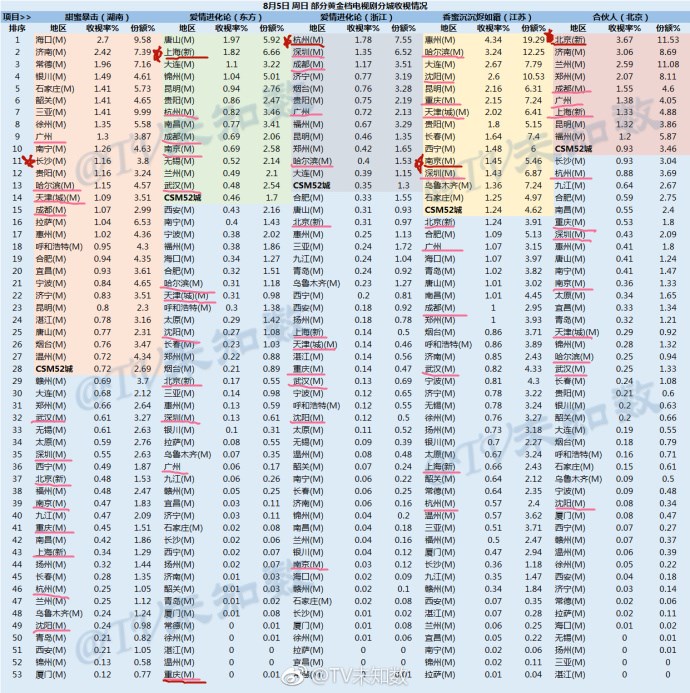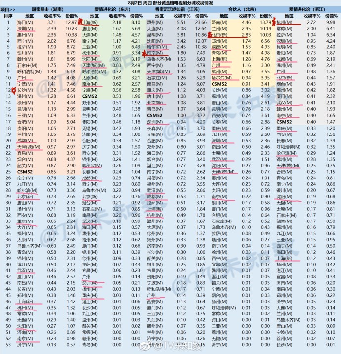 Trên mạng xã hội Weibo có cư dân mạng đăng tải bảng thống kê thành tích phân ra từng khu vực của các phim truyền hình ngày 2 tháng 8 và 5 tháng 8. Cư dân mạng đã chỉ ra trong bảng phân tích có tổng cộng 12 thành phố có tỷ lệ người xem có quyền quyết định lớn đối với chỉ số rating.