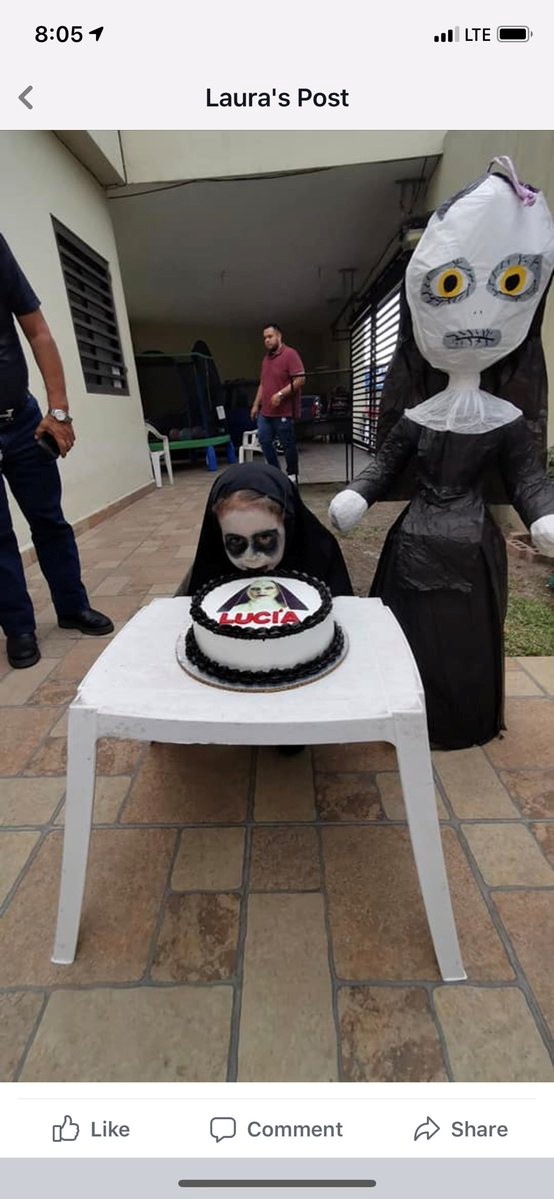 Mới đây, hình ảnh về cô bé Lucia cùng bữa tiệc sinh nhật phong cách ma sơ đã gây bão mạng xã hội. Dì của Lucia là Andrea đã đăng bức ảnh cháu mình trong trang phục Valak mặt đầy hãnh diện đứng cạnh một hình nộm cũng ám ảnh không kém với dòng chú thích: “À đây là sinh nhật 3 tuổi của cháu gái tôi. Thay vì phong cách bình thường thì đây là những gì nó đã chọn.”