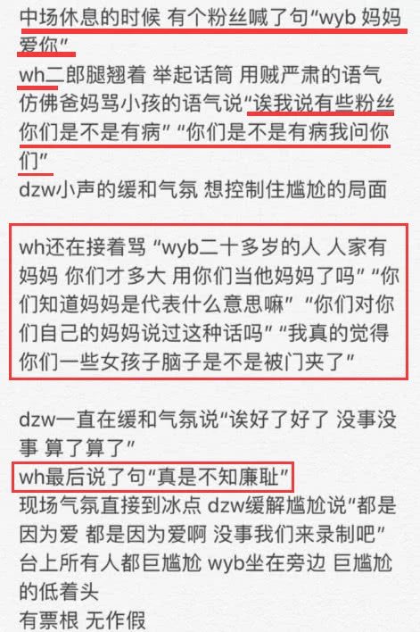Trong quá trình nghỉ ngơi, fan hâm mộ Vương Nhất Bác bày tỏ nói: “Vương Nhất Bác, mẹ yêu anh (妈妈爱你)“. Rất nhiều fan hâm mộ đều dùng khẩu hiệu này, tự xưng là mẹ. Uông Hàm sau khi nghe xong đã trực tiếp mắng: “Tôi nói có phải những fan hâm mộ kia bị bệnh không. Các bạn có bệnh không, tôi hỏi các bạn đó? Vương Nhất Bác người ta hơn 20 tuổi, người ta có mẹ. Còn các bạn bao nhiêu tuổi, để các người trở thành mẹ cậu ấy sao?”, “Tôi thật cảm thấy các cô gái như các người có phải não bị cửa kẹp rồi không, thật sự không biết liêm sỉ”.