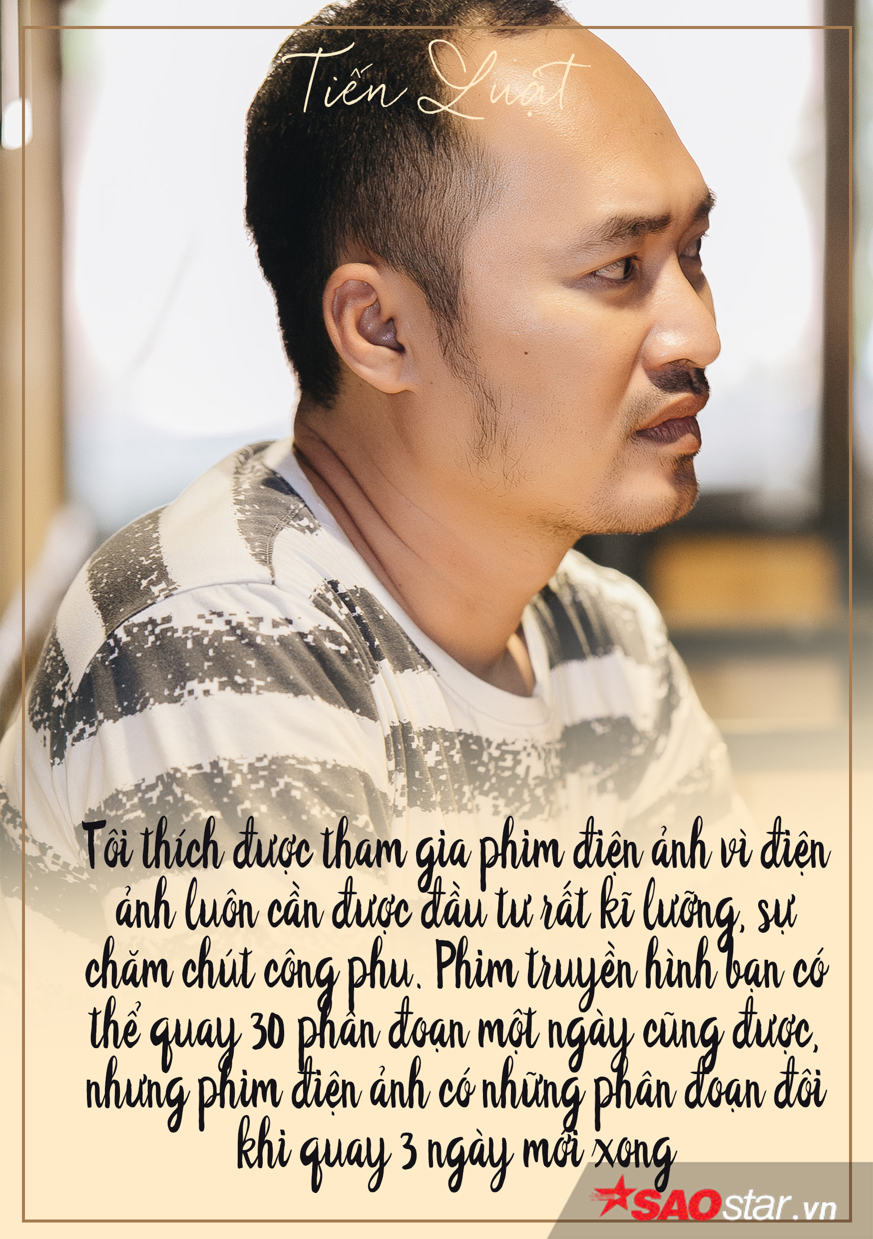 Với anh khi đã xuất hiện trên khung hình điện ảnh, nghĩa là hình ảnh của bạn sẽ phải chăm chút kĩ hơn rất nhiều, mỗi cử chỉ, hành động đều không thể qua được sự theo dõi của khán giả ngồi xem. Vì thế làm phim điện ảnh cần sự chỉn chu từ khâu biên tập đầu tiên cho đến khâu hậu kì sau cùng. “Tôi thích được tham gia phim điện ảnh vì điện ảnh luôn cần được đầu tư rất kĩ lưỡng, sự chăm chút công phu. Phim truyền hình bạn có thể quay 30 phân đoạn một ngày cũng được, nhưng phim điện ảnh có những phân đoạn đôi khi quay 3 ngày mới xong”. Dù cực vậy nhưng Tiến Luật luôn cảm thấy hạnh phúc mỗi khi xem lại những cảnh quay mà cả ekip phải đánh vật suốt nhiều ngày liền. Cống hiến hết mình cho nghệ thuật đôi khi chính là làm hết sức để mang lại điều tốt nhất cho khán giả.