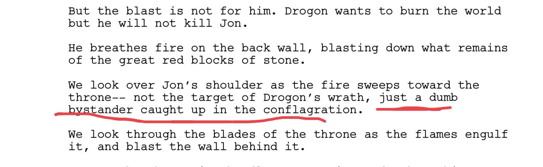 ”Ngọn lửa vượt qua vai Jon Snow và hướng thẳng về chiếc ngai. Thì ra Jon không phải mục tiêu cho cơn giận của con rồng, mà chỉ là một gã ngốc đứng bên đường quan sát.”