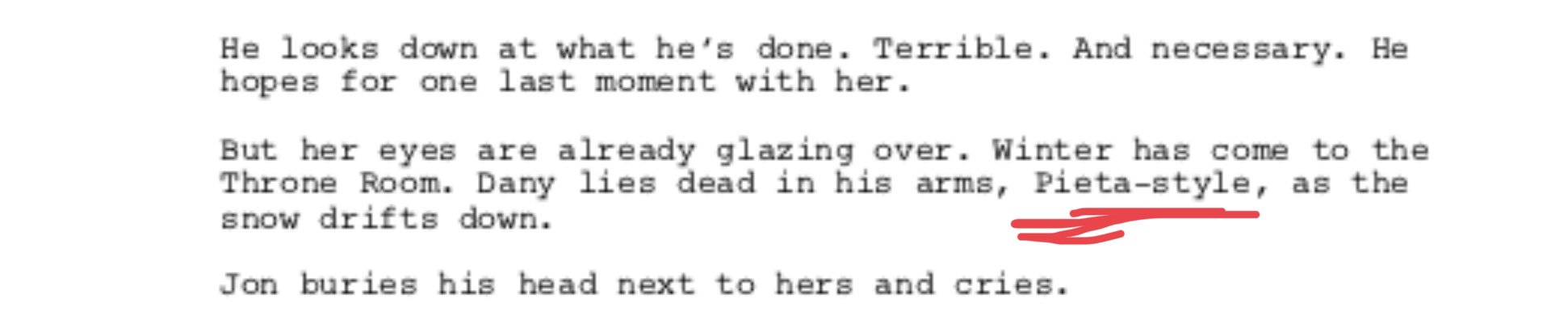 “Cái xác của Dany rũ ra trong tay anh, như bức tượng Pieta thời Phục Hưng, trong khi tuyết bay lả tả”.