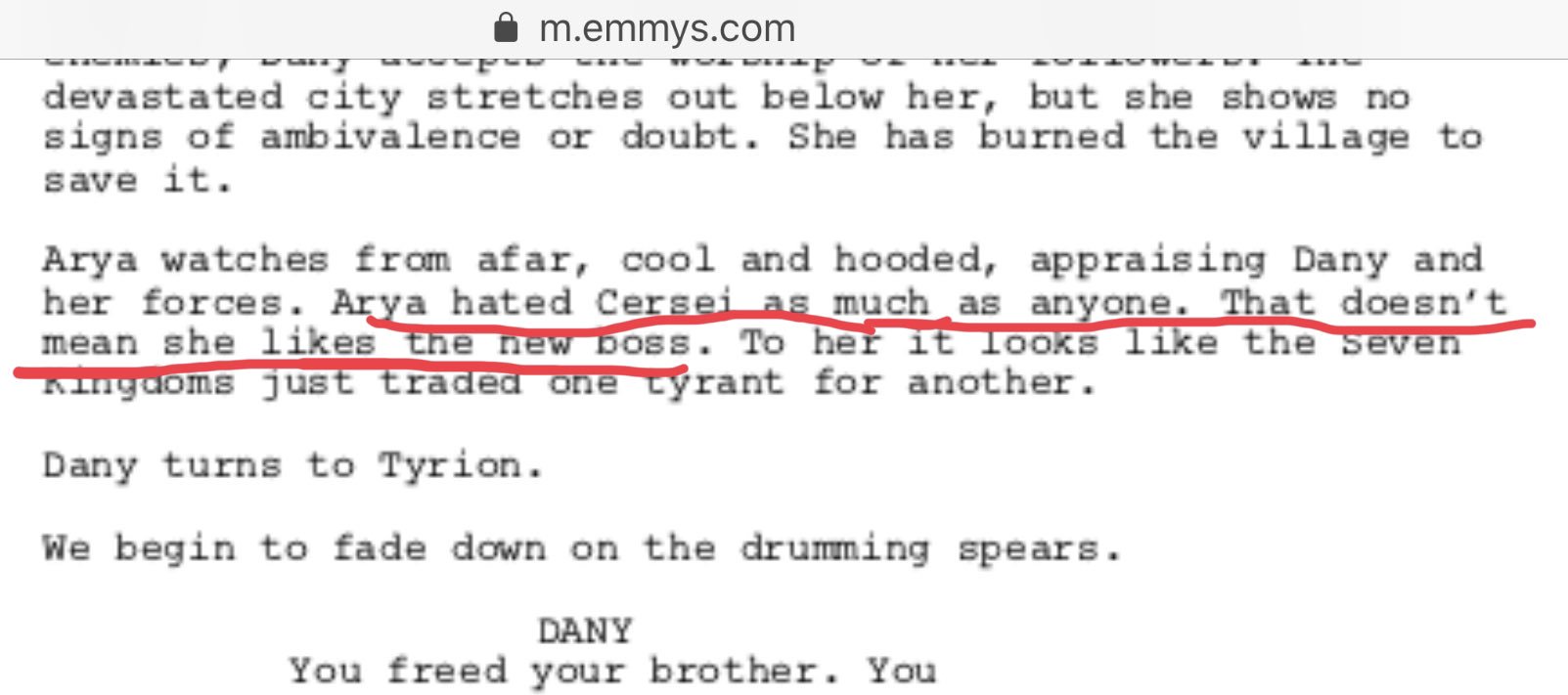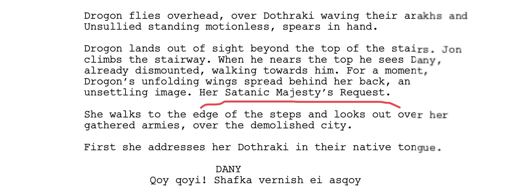 Mới đây, nhân dịp Game of Thrones nhận được hơn 30 đề cử tại lễ trao giải Emmy danh giá, trang web chính thức của giải thưởng này đã đăng tải kịch bản gốc tập cuối season 8 - tập phim được đề cử giải Kịch Bản Xuất Sắc Nhất. Ngay khi đọc được tập kịch bản này, nhiều fan đã nhanh chóng chỉ ra những câu cú hết sức vớ vẩn, không hề sử dụng ngôn từ cổ quen thuộc của Game of Thrones, mà tràn ngập những lời lẽ, tiếng lóng như một bộ phim học đường.