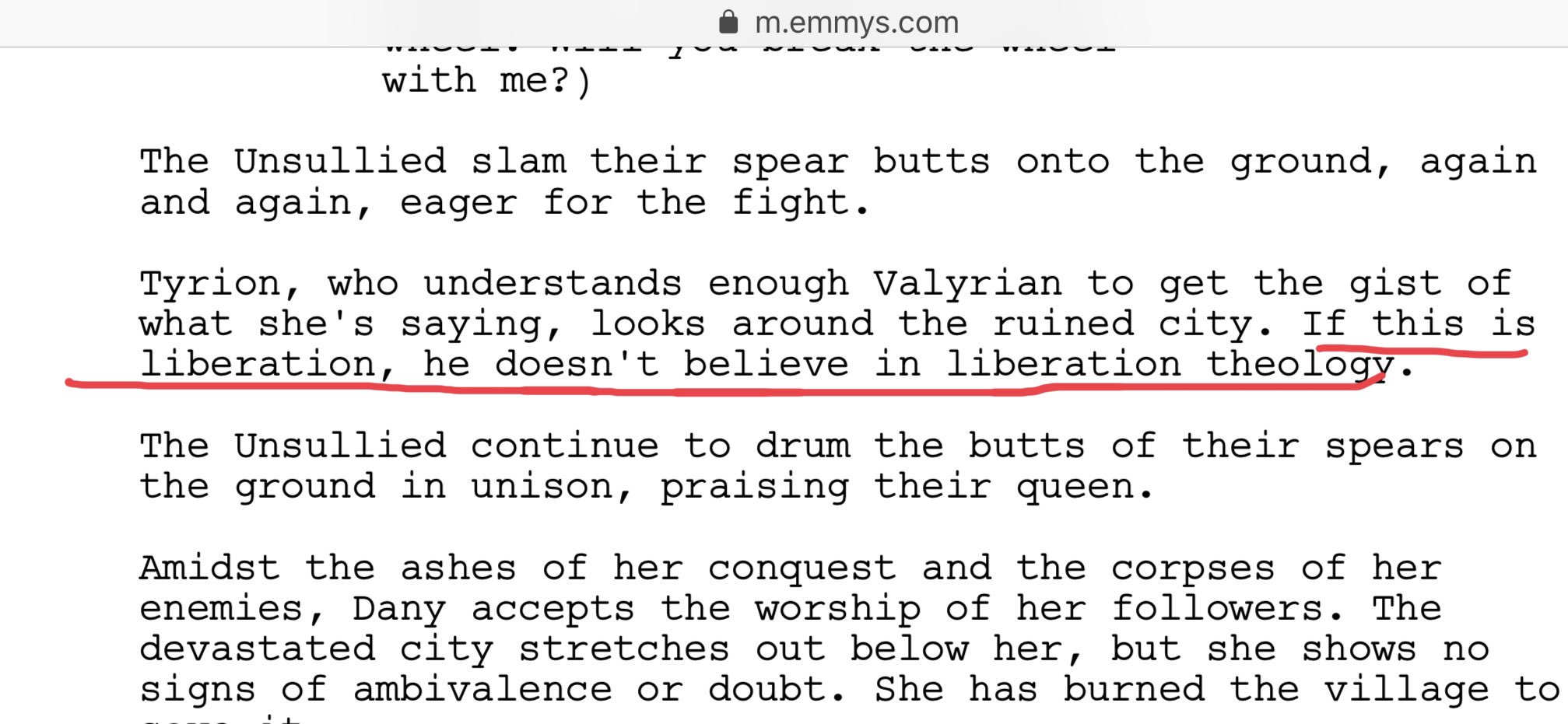 Trong đoạn chàng lùn Tyrion Lannister - quân sư của nữ hoàng Daenerys Targaryen chứng kiến cô hô hào ba quân theo mình, sau khi vừa tàn sát cả một thành phố, kịch bản có chứa những câu giải thích vô duyên cùng cực, như: “Tyrion, vốn hiểu tiếng Valyria vừa đủ để biết nữ hoàng đang nói gì, nhìn xung quanh thành phố đổ nát. Nếu đây là sự giải phóng, thì anh không thể tin vào học thuyết giải phóng được nữa”.