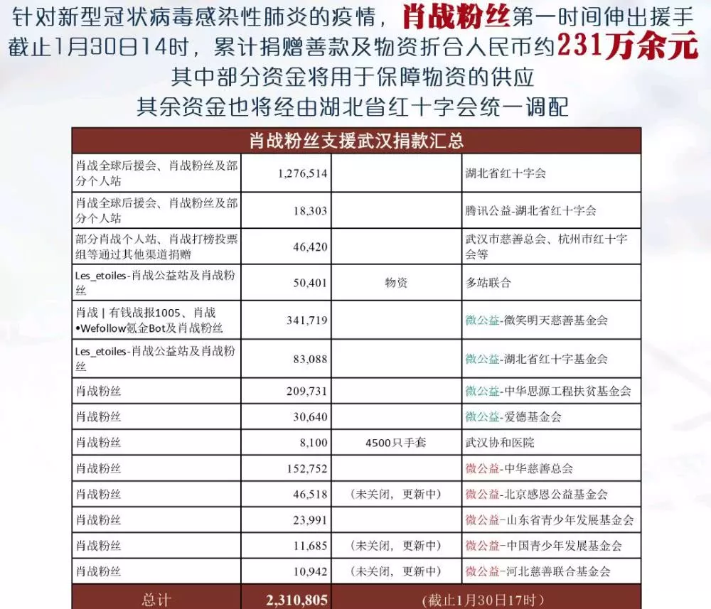 Đối mặt với việc bị “ép quyên góp” cũng như nghi vấn của dư luận, fan hâm mộ Tiêu Chiến tiến hành phát động, giúp đỡ Vũ Hán. Theo thống kê đến 17 giờ ngày 30, fandom Tiêu Chiến đã quyên góp số tiền cùng vật phẩm thiết yếu tương đương khoảng hơn 2,31 triệu NDT (7,8 tỷ đồng). Hy vọng số tiền này có thể giúp đỡ được phần nào cho người dân nhiễm phải bệnh. Fan hâm mộ Tiêu Chiến còn đăng tải giấy chứng nhận quyên góp để chứng minh, dùng chứng cứ xác thực để đánh bại những lời công kích cũng như nghi vấn trên mạng.