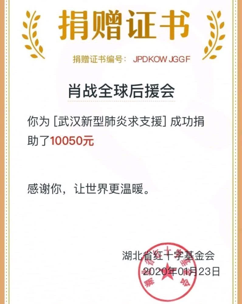 Cách đây không lâu, có rất nhiều người đều nói Tiêu Chiến đã giúp đỡ 400 ngàn NDT (1,32 tỷ đồng), cũng chính vì vậy mà dân mạng thi nhau tìm kiếm tin tức đó, nhưng vẫn không có số liệu xác thực nào chứng minh Tiêu Chiến đã quyên góp. Truyền thông cũng đã thống kê chi tiết danh sách những minh tinh quyên góp nhưng mọi người “xem tới xem lui” vẫn không tìm được tin tức hay bằng chứng chứng minh Tiêu Chiến quyên tiền giúp đỡ Vũ Hán.