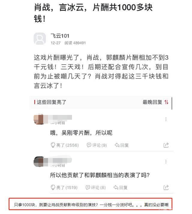 Sau đó lại có blogger tiết lộ thù lao của Tiêu Chiến trong Khánh dư niên chỉ có 1000 NDT (3,4 triệu đồng). Fan hâm mộ lên tiếng minh oan cho thần tượng, bày tỏ Tiêu Chiến chỉ quay ba ngày, hậu kỳ còn phải phối hợp quảng bá mấy lần. Nhưng khi nhân vật này lên sóng, khả năng diễn xuất của Tiêu Chiến luôn bị chỉ trích. Dựa vào thù lao mà nói, Tiêu Chiến đã diễn xứng đáng với nhân vật Ngôn Băng Vân này rồi: “Chỉ lấy có 1000 NDT mà muốn Tiêu Chiến công hiến khả năng diễn xuất cấp bậc ảnh đế? Bỏ bao nhiêu thì lấy bấy nhiêu, không cần phải cười nhạo”.