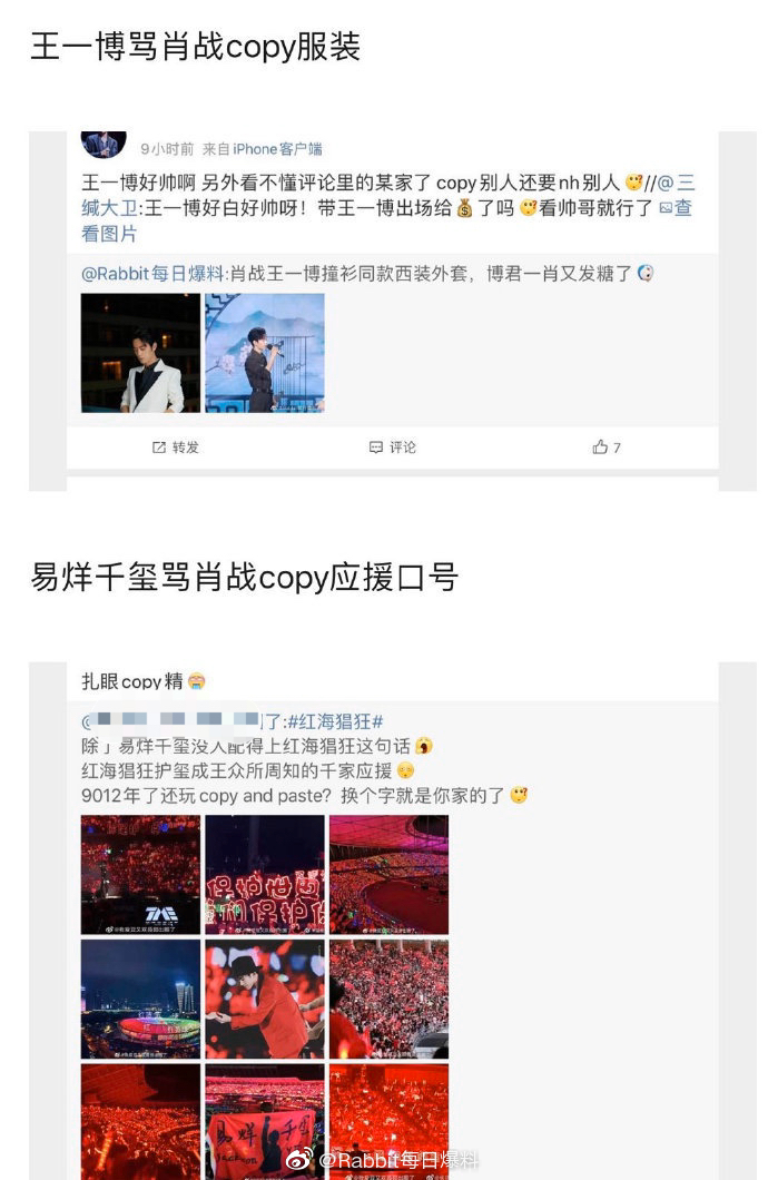 Nếu như fan hâm mộ nhà Chu Chính Đình nói Tiêu Chiến copy tạp chí thì fan nhà Vương Nhất Bác mỉa mai Tiêu Chiến sao chép trang phục. Trong khi đó, fan hâm mộ nhà Dịch Dương Thiên Tỉ chỉ trích fan Tiêu Chiến copy khẩu hiệu tiếp ứng, còn fan nhà Chu Nhất Long nói Tiêu Chiến copy lời trích bài đăng.