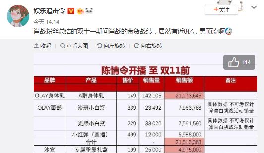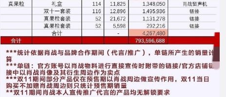 Mới đây, một bảng thống kê số lượng hàng hóa bán ra cùng doanh thu của những đại ngôn sản phẩm do Tiêu Chiến làm đại diện được công bố. Tổng doanh thu của toàn bộ mặt hàng hợp tác với Tiêu Chiến lên đến gần 800 triệu NDT (2720 tỷ đồng). Số liệu khiến dân mạng và truyền thông phải bội phục trước khả năng thương mại và sức hút đáng kinh ngạc của nam chính Trần tình lệnh.
