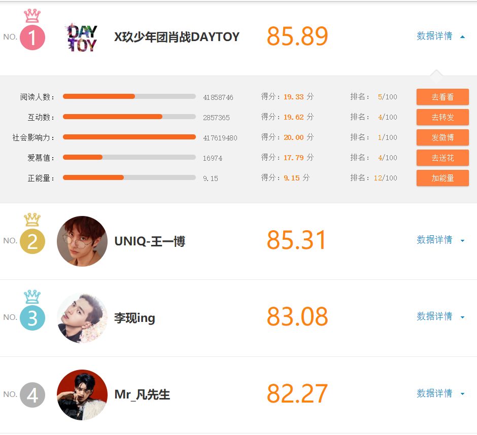Theo sau Tiêu Chiến là Vương Nhất Bác, Lý Hiện, Ngô Diệc Phàm,…
