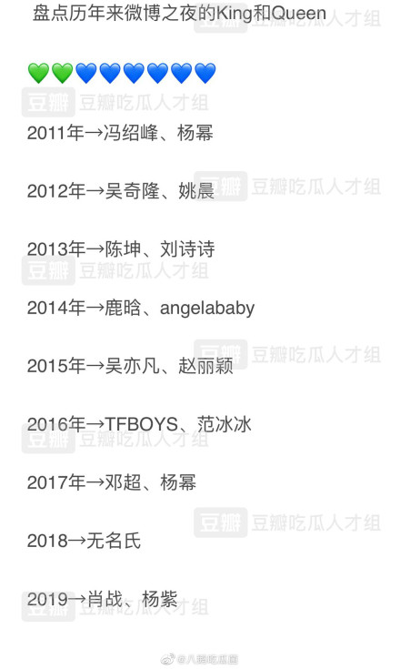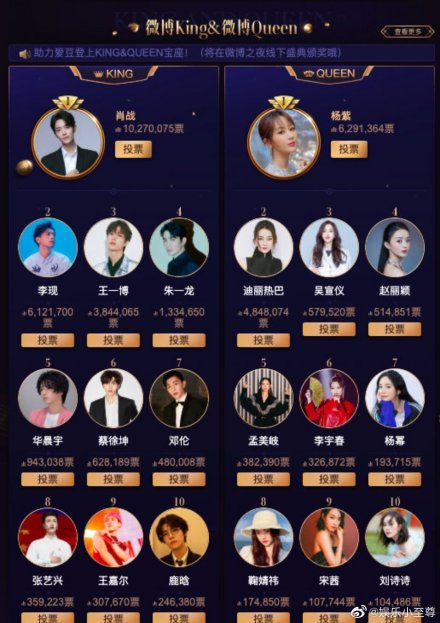 Với kết quả trên, Tiêu Chiến và Dương Tử chính thức trở thành King và Queen năm nay của Weibo chi dạ. Và danh sách một số King và Queen qua các năm khác như sau: