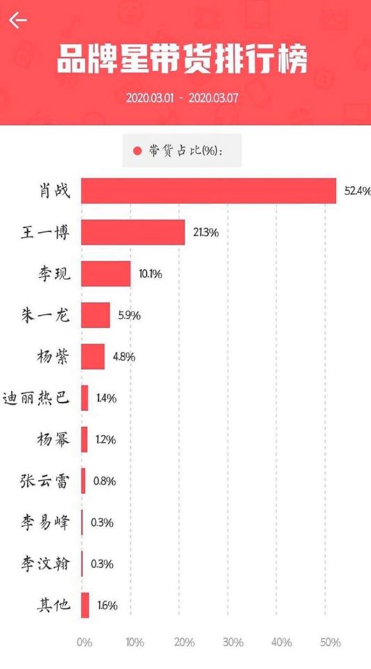 Mới đây bảng xếp hạng ngôi sao mang hàng (khả năng tiêu thụ sản phẩm các nghệ sĩ đại ngôn) của các ngôi sao Hoa ngữ từ 1/3 - 7/3/2020 vừa được công bố: