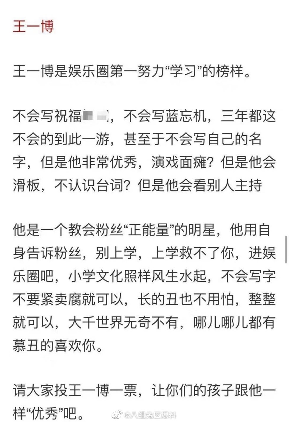 Trong khi đó, Vương Nhất Bác bị cười nhạo học lực không biết viết cả chữ chúc phúc, không biết viết chữ Lam Vong Cơ và thậm chí là không biết viết cả tên của mình. Ngoài ra thì tướng mạo của anh chàng bị mỉa mai là xấu xí…