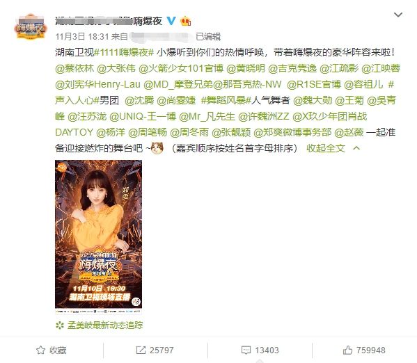 Cuối cùng vào tối qua, đài truyền hình Hồ Nam đã công bố dàn khách mời, ngoại trừ những ca sĩ thực lực như Thái Y Lâm, Trương Lương Dĩnh, Ngô Thanh Phong… thì cũng có sự góp mặt của hai nhóm nhạc thần tượng là Hỏa tiễn thiếu nữ 101 và RISE. Nhưng tiêu điểm của dàn khách mời này vẫn là Tiêu Chiến và Vương Nhất Bác.