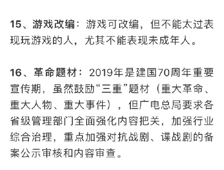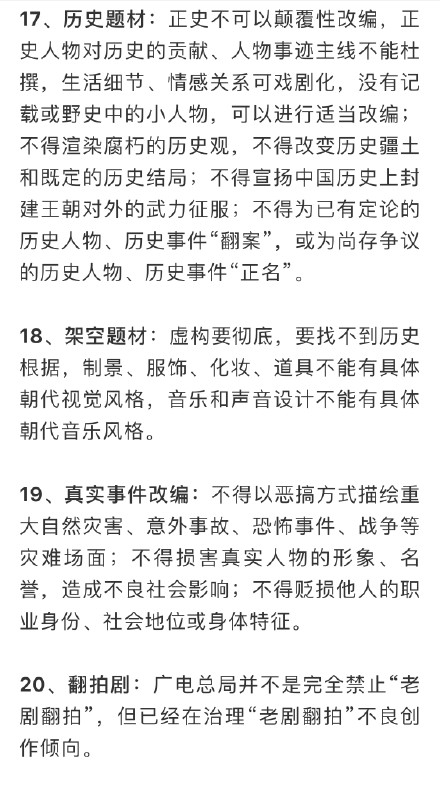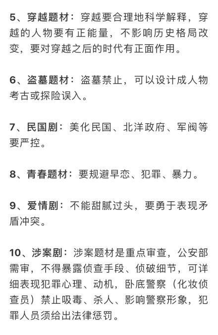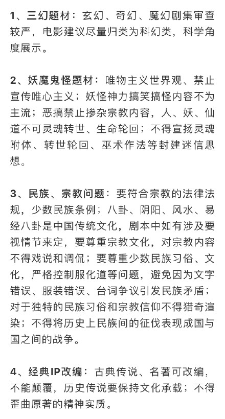 Phim truyền hình đề tài: Huyền huyễn, Kỳ huyễn, Ma huyễn bị kiểm tra tương đối nghiêm ngặt. Thể loại điện ảnh được kiến nghị nên quay những loại hình về loại khoa học viễn tưởng, đứng dưới góc độ khoa học để triển khai chúng.