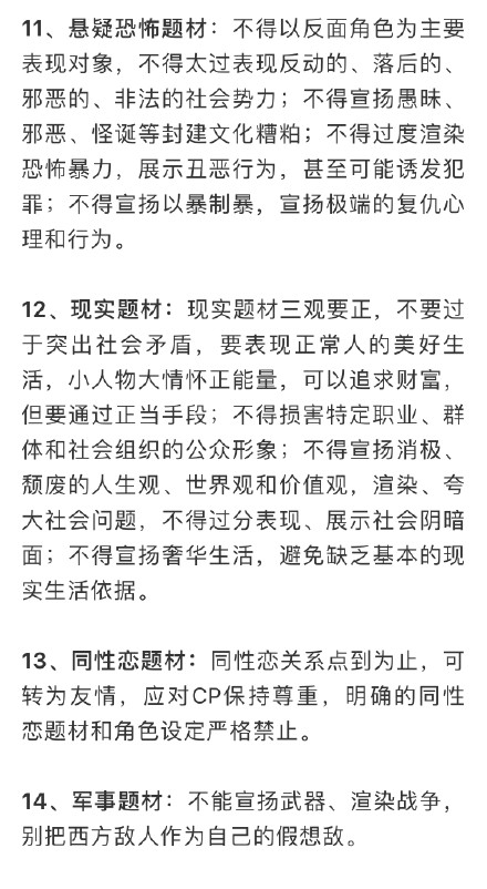 Không thể lấy nhân vật phản diện làm đối tượng chủ đề, không được triển khai quá lố những mặt xã hội như phản động, lạc hậu, tà ác, phi pháp…