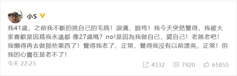 Theo tin tức giải trí báo Sina, tối ngày 5/6, Tiểu S đăng trên Weibo cá nhân của mình, trước đây cô rất để tâm đến vẻ ngoài của bản thân, nhưng giờ đã nhận ra, mọi người thích cô không phải vì cô luôn xinh đẹp như khi 27 tuổi, mà do cô luôn yêu bản thân và làm chính mình. Tuy nhiên tâm hồn mới thật sự quan trọng, điều đó khiến cô không bao giờ già đi.