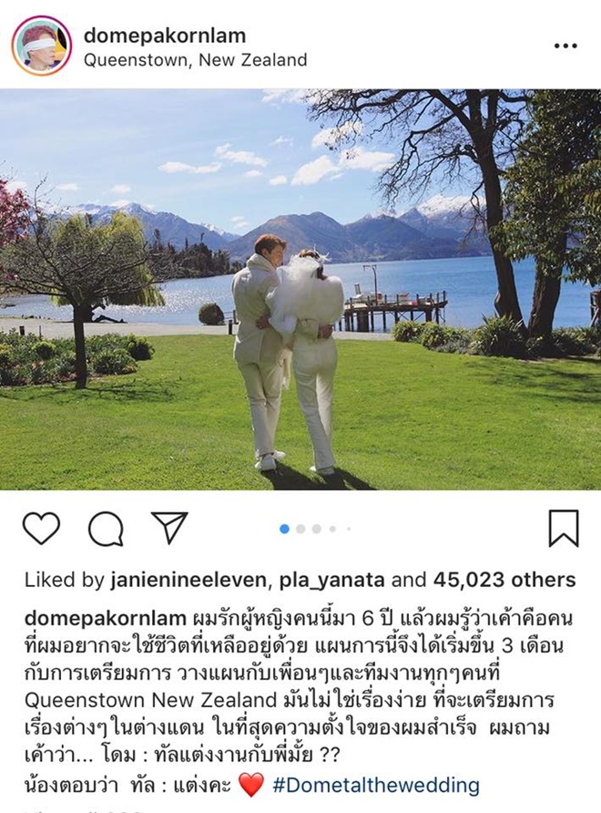 Sau Push Puttichai và Kan Kantathavorn, hai người đàn ông được hàng triệu phụ nữ Thái Lan mê mẩn thì Dome Pakorn Lam sẽ là nam thần tiếp theo quyết định từ bỏ cuộc sống độc thân để lập gia đình. Ngày 14/9, Dome đã chia sẻ tin vui này đến người hâm mộ thông qua Instagram cá nhân.