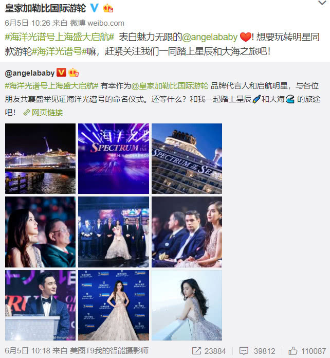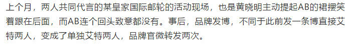5. Hoạt động vào tháng trước, Huỳnh Hiểu Minh nâng váy giúp Angelababy nhưng Angelababy không hề quay mặt lại nhìn Huỳnh Hiểu Minh một lần. Đăng bài cho các sản phẩm nổi tiếng cũng là mạnh ai nấy đăng, weibo chính thức của sản phẩm cũng chia sẻ hai lần.