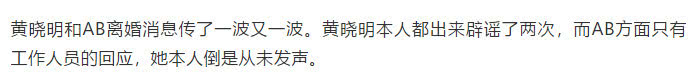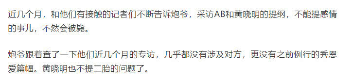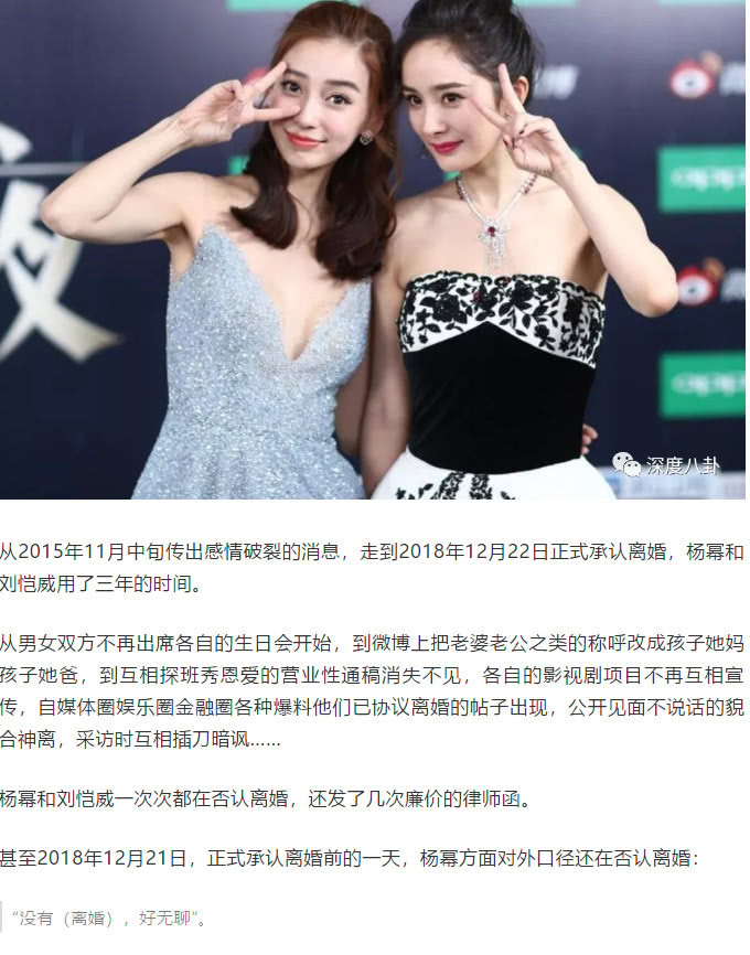 Trong bài viết này còn cho rằng tình trạng trước mắt của Huỳnh Hiểu Minh và Angelababy rất có khả năng giống với tình huống của Lưu Khải Uy và Dương Mịch. Dù sao Lưu Khải Uy và Dương Mịch cũng nhiều lần phủ nhận ly hôn, thậm chí trước khi ly hôn một ngày Dương Mịch còn lên tiếng thanh minh, phủ nhận tin đồn.