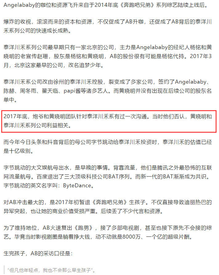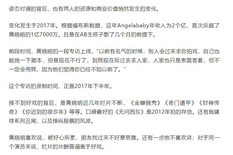 Ngoài ra thì bài viết còn chỉ ra một số điểm ở cuối đoạn văn, vốn dĩ trong chuyện tình cảm của hai người thì Huỳnh Hiểu Minh chiếm thế chủ động nhưng từ năm 2017 thì thế cục này đã thay đổi. Sau khi Angelababy sinh con nghỉ ngơi vài tháng thì thu nhập của Angelababy đã vượt qua Huỳnh Hiểu Minh, đạt được con số 200 triệu NDT. Huỳnh Hiểu Minh trong một lần phỏng vấn cũng từng nói bản thân giờ chọn không được kịch bản.