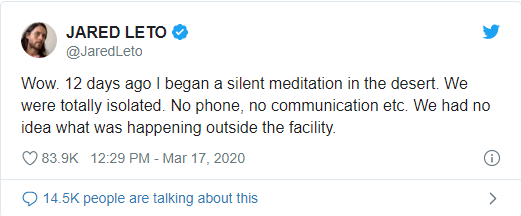 Jared Leto đã thừa nhận rằng mình không hề biết sự lan truyền nhanh chóng của virus Corona trong những ngày qua. Trên Twitter cá nhân của mình, anh đã đăng tải dòng trạng thái: “Wow. 12 ngày trước tôi đã bắt đầu quá trình thiền ở sa mạc. Chúng tôi đã hoàn toàn bị cô lập với thế giới. Không điện thoại, không bất kì sự liên lạc nào. Chúng tôi không biết bất kì điều gì xảy ra ngoài cơ sở đó.”