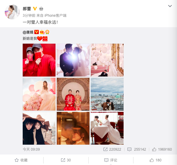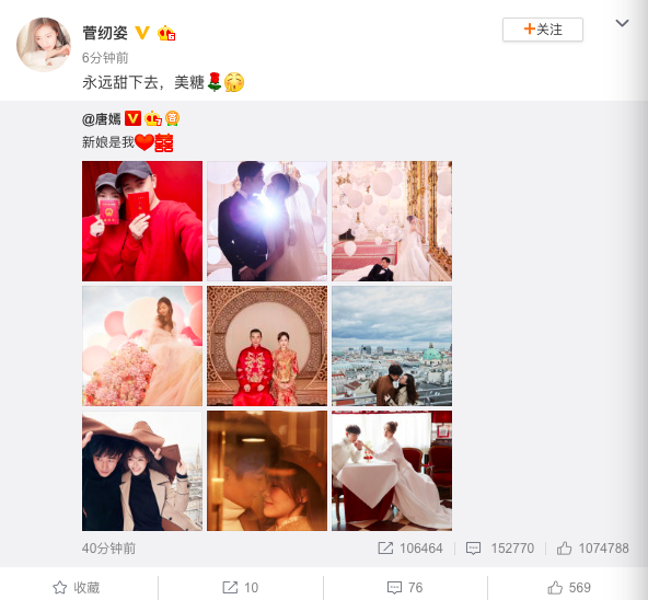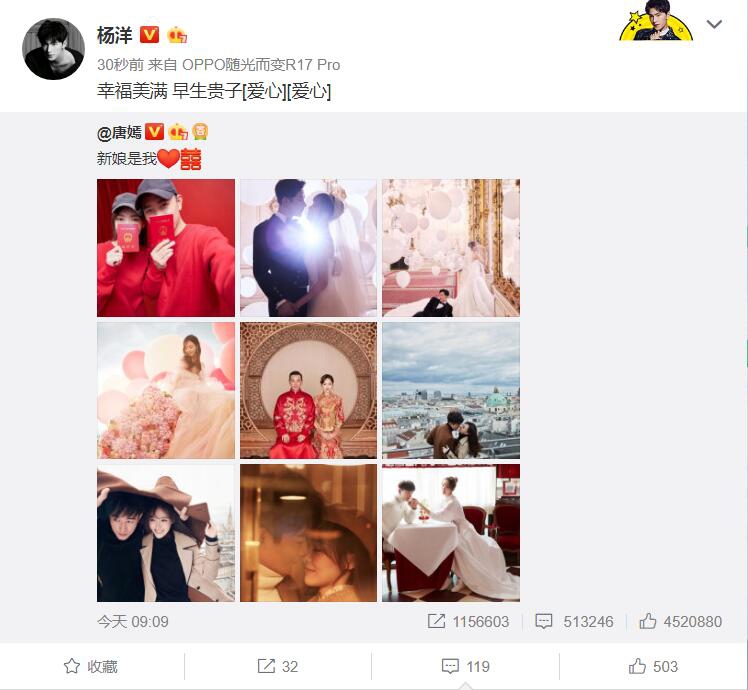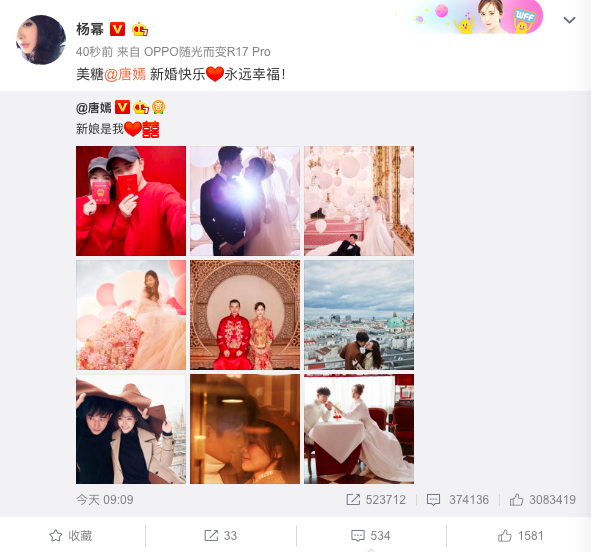 - Dương Mịch: “Mỹ Đường, tân hôn vui vẻ, mãi mãi hạnh phúc”.