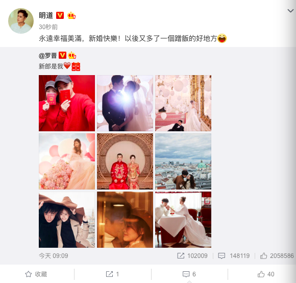- Lưu Đào: “Chúc La Tấn và Đường Yên tân hôn vui vẻ - ngọt ngào hạnh phúc! Cầm sắt hòa minh, vĩnh kết đồng tâm!
